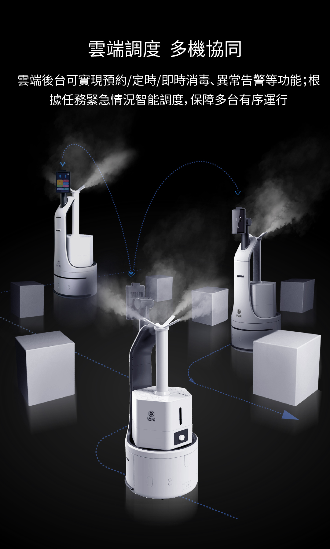 雲端後台可實現預約/定時/即時消毒、異常告警等功能;根據任務緊急情況智能調度,保障多台有序運行