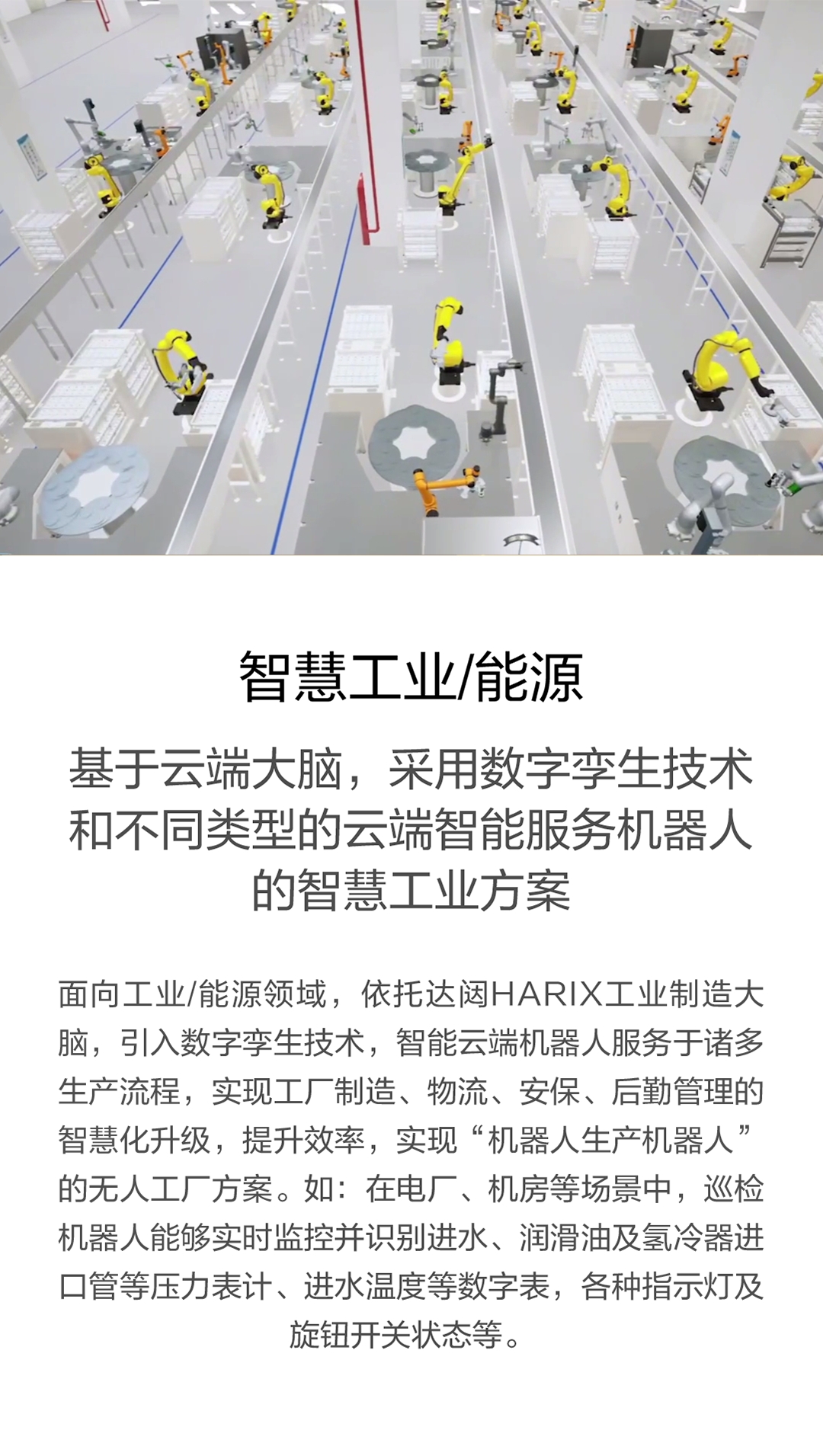 端机器人服务于诸多生产流程,实现工厂制造、物流、安保、后勤管理的智慧化